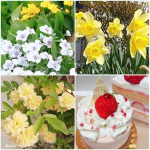 我が家で咲いていたお花🌼 &可愛いケーキ🍰 今も健在なのはビオラ✨ ❄雪に埋れてもヘッチャラ💪 長く楽しめる強い子ですね🧡 モッコウバラすでにイイとこ終わっちゃってる💫 (*´罒`*)春は短いなぁയꕤ*.゚
