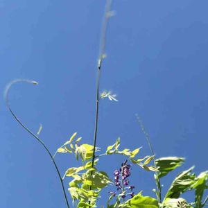💙 ゚・*:.。.空と植物.。.:*・゜💜 おはようございます❣︎ 💜猛暑の中〜公園の藤の花が咲いている❣️👀 💜春ほどのきらびやかさはないけど 青空に向かって上を向いているヾ(●´∇`●)ノ 🐲ツル2本は龍の髭〜🐉