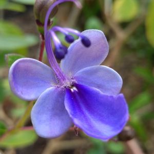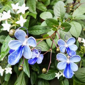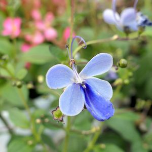 【ブルーエルフィン(ベンケイクサギ・クレロデンドルム)】 熱帯アフリカ・熱帯アジア原産、クマツヅラ科の常緑つる性低木 ブルーエルフィン(青い妖精)のほか、ブルーバタフライ(青い蝶)やブルーウイング(青い翼)などと呼ばれる。 左右に広げた花弁に、カールした雌しべと雄しべが蝶のように見え、青い美しい花を咲かせる。 5個の花弁のうち、4個は空色、1個は濃い青紫色。 草丈:60~100cm 開花期:7月~10月 JAグリーンコア@山口市