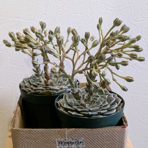 去年、富士見高原のファーマーズマーケットにて購入したタキタスキングスター。子株からもお花! 今年も行けたので、好きすぎて、もうひとつお迎え〜。 冬は、よくシワシワになってたな、水が好きな多肉。