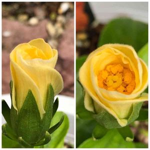 おはようございます😊 ハイビスカスイエロー2番花🌺咲きました💕 お天気が不安定なせいか少し元気がない咲き方です😥