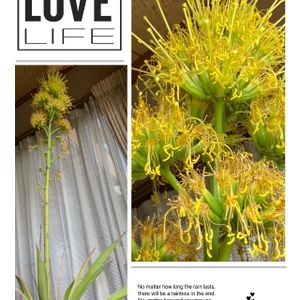 こんばんわ🌠 近所のタニ友さんのところで、 アガベのベネズエラさんが、開花してます。 背丈は、もうすぐ天井につきそうです。 終盤で今てっぺんまでお花が咲いてます。