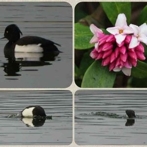 こんにちは🎵 今日は寒いですね~。 「沈丁花とキンクロハジロ」 74番札所甲山寺の沈丁花が咲き始め良い香りを漂わせていました。 散策からの帰路、近くの溜め池で盛んに頭から潜っている珍しい水鳥さんに出会いました。 帰って調べるとキンクロハジロのオスと判明、海ガモ類で巧みに潜水し貝・魚・水草を食べるそうです。 撮影日 2020.2.15