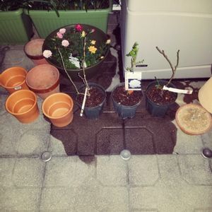 昨夜届いた薔薇達2 薔薇大苗手前の3鉢 赤系 ミスターリンカーン 黄色系 ゴールデンハート 白系 ビブラマリエ 後ろの丸鉢は、風避けで入れたミニ薔薇たち こんなに育てられるかな?(笑)