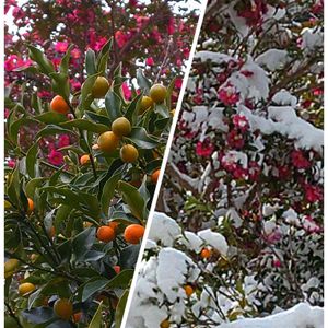 🌿❤️🤍山茶花とキンカン🤍❤️🌿 ⬅️は2・3日前の山茶花の様子 ➡️は昨日の山茶花の様子 ビックリです😲わが町ではこれ程の雪は10年振りかの大雪❄️☃️ 思わずパシャリ🤳 お花達はどんなかな~⁉️🙄😅 皆さん雪に依る被害無かったでしょうか⁉️🙇 今日も良い1日を~⤴️🥰