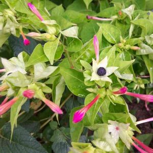 ウォーキング出会った出会ったお花 オシロイバナに黒い種が、、 種ををつぶすと 白粉(おしろい)のような ”白い粉”が出てくる。名前の由来はそこから。 懐かしいなあ