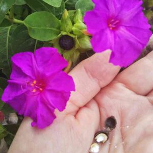 オシロイバナのガクと種 ガクも大きくてキレイなんですよ! 花を知らなければ これが花?と勘違いしてしまいます。 真っ黒な玉は種です。 種を割ると中から おしろい粉のような白い粉が! 左下はこれから咲くツボミ。 右下は咲いてる時の花。
