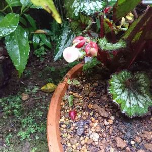 こんにちは🙇雨ですね😵 雨の中レックスベゴニアの蕾がもうすぐ咲きそうです👍。
