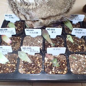 ミックスベリアとスマロの 葉挿しっ子ちゃん達を撮ろうと思ったら ぬんっと出てきて危ないとこだった😅 ももりん以外は発芽済み🙌🏻 一番出て欲しいのになぁ… 成長が楽しみ💕