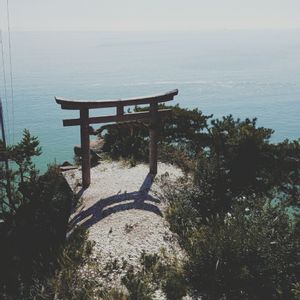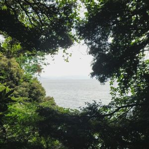 都久夫須麻神社をお詣りしてから竜神拝所に。 神社のすぐ前。 かわら投げで鳥居をくぐれば願い事が叶うそうです。 眼下にひろがる湖。 (ФωФ)ほぉ… 湖面がキラキラ✨していました。 鳥居をかこむようにはえた木々の緑が目に染みました。