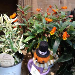 こんばんは 今日は敬老の日ですね あと~ハロウィンが 10月31日(日)ですね 今日は午後から園芸店に この2つのイベントの お花のを見に行きました! 敬老の日は 胡蝶蘭と観葉植物にマムが メインですね~ ハロウィンはと見ると 観賞用とうがらしとペペちゃん? まだまだこれから出てくるとは 思いますが楽しみですね ただ1種見た事のない 大好物のオレンジ色のお花 『シーマニアジャックランタン』 ハロウィンの飾りに人気があるみたいで 南米のお花みたいです ハロウィン仕様で可愛いお花です お花は金魚が口を開けているような 筒状のお花です! それかランタンがぶら下がっているみたいです~ 丁度今頃から咲くみたいですよー 本来のシーマニアさんより 大きく咲く品種みたいですね!