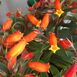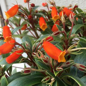 シーマニア ジャックランタン (イワタバコ科) アルゼンチン、ペルー、ボリビアなど熱帯アメリカに分布する植物 金魚がお口をパクパクさせているような筒状の先が反ってるような オレンジ🧡に黄色💛のおはなを咲かせます ジャックランタンは従来のシーマニアよりお花が大きい品種だそうてす シーマニアの名前で流通してるのはグロキシニア・シルバラティカと鮮やかなチェリーレッドのお花を咲かせるグロキシニア・ネマタントデス 以前はイワタバコ科のシーマニア属でしたが現在はグロキシニア属 ジャックランタンとは南瓜のロウソク立てということで ハロウィンシーズンのデコレーションにいいようです 花言葉 繁栄 コミュニケーション