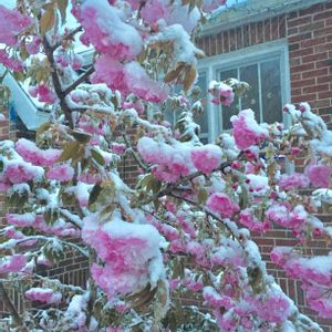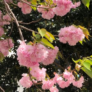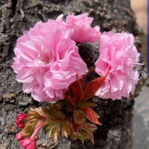 咲いててビックリ❣️豪華でビックリ❣️ 八重桜 関山(カンザン、セキヤマ) 花に芳香があることから「桜茶」の原料になる花で、雌蕊が2個葉化 日本を原産とするサトザクラ及びヤエザクラの代表種。花は大型の八重咲き。 ピンク色が濃く、花びら42〜55枚😳 その派手さと性質の強健さが西洋人に好まれ、欧米文化圏をはじめとして世界各地に植栽されているそうです。 花期はソメイヨシノより遅く、そして開花期間は長い。 実はならない。 ・オオシマザクラから作出された交雑種と考えられるが、その歴史は古く、似たようなサトザクラであるフゲンゾウと共に奈良時代から伝わるという。