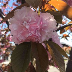 これはサクラ? 桜通りという名前の街路樹だけど、ソメイヨシノとは違うし… Googleだとカンザンと出ました 分かる方いらっしゃいますか? 追記:どうやら八重桜の一種のようです