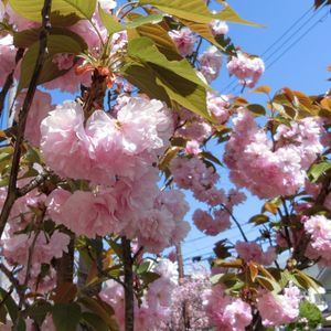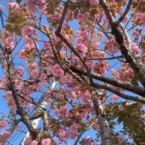 関山、カンザン、せきやま、ともいうらしい。 桜の後🌸で咲き、花と一緒に葉もでます。 花びらを桜湯にすると書いてありました。 そういえば、桜の湯のんだことあった。 この花びら使うんだ。