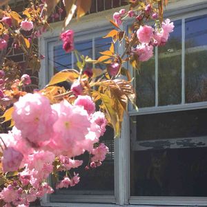 2021,4 右手前 濃いピンクのカンザン 後ろ奥薄いピンクのショウゲツ 左側 葉桜ソメイヨシノ 桜の季節がそろそろ終わりです😌
