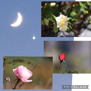 11月8日 PM5:30頃の月と 散歩道の薔薇🌹🌹🌹 月🌙と金星⭐が接近してます。 南西の空です🤗