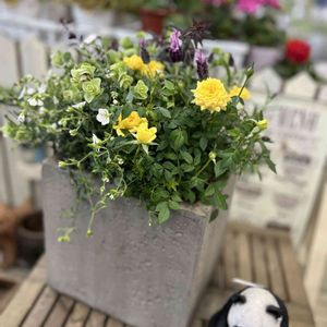♡今週の寄せ植え♡ スクエアポットに香るオレガノケントビューティー、 ラベンダーバルセロナローズを寄せています イエローのミニバラとバルセロナローズのパープルは 補色という特別な関係。。。お互いを呼び求めあうカラー♪ 足元のアレナリアで動きもプラス♡