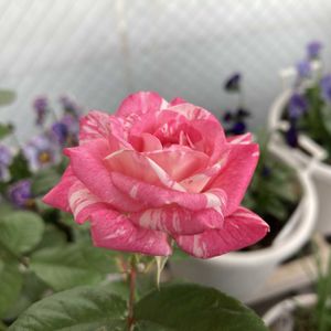 挿し芽の赤いマーブル薔薇から初めてピンクの子🌹 かわいい〜🥰 次の蕾は何色が咲くかな? もう寒いから蕾は開かないかな?