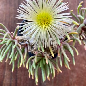 冬型メセンのラビエイ ワサワサしてきました。寒いけどとても調子よさそう。先端が少しピンクな柔らかい触手が蠱惑的。触手は透明な水泡状のツブでおおわれていて中にミネラルを貯めているらしい。これが特徴的な透明感というか柔らかさを現すのに一役かっています。彼らは水が欲しいとすぐに葉がシオっとするのでタイミングがわかりやすいです。 ちょっと王蟲の口から出てるアレっぽい。その者青木衣を纏てってやつ。