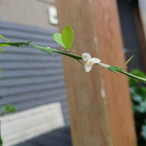 寒さ除けで、簡易的なビニール温室に入れてあったフィンガーライムに花が咲いていました。 温室で温まり過ぎたので、出すことにしました。