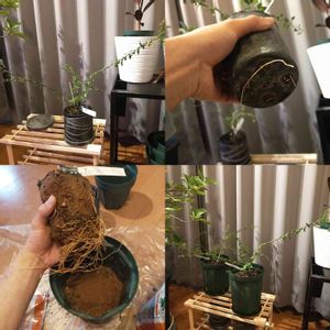 育苗ポットで育て続けてたフィンガーライム(接ぎ木苗)を植え替えます 育苗ポットの底からぴょろんと根が出ちゃってました 横方向にはそんな根は張ってないけど、下方向にバッチリ伸びてて絡まってました。 根鉢の底をほぐしたら育苗ポットの倍の長さも根が伸びてます。 縦長の2回りくらい大きなスリット鉢に植え替えました もう少し夜の気温が上がったらバルコニーに出したいけど、今年はアブラムシがもう生まれはじめてるから少し心配です🤔