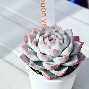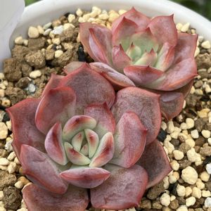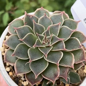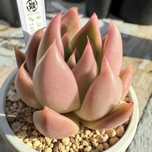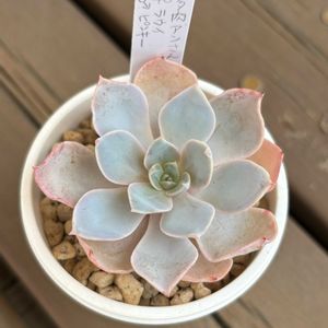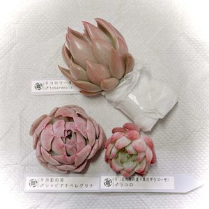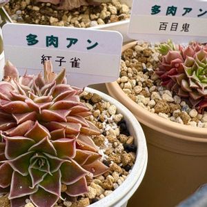 【我が家のAランク多肉】 Pic①② 言わずもがなのオレンジ札様✨️ 春の多肉とみどりのマルシェinなばなの里にてお迎えした “elegans×lindsayana” 並んでる間にひいた別のブースのクジがまさかの4番で、nicoriさんブースの入場開始と丸被りし泣く泣く夫に購入を託し、お目当ての子は逃したもののコチラをget🤗 ただの付き添いのつもりで来ていたアガベ好き夫は未知のエケベリアにまみれてパニクりつつも、“buon veccio”の札のささった子を確保せよ!の任務を無事遂行🫡 品種なんて見た目で分かる訳もなく、札も英語、しかも筆記体ときちゃあ何がなんやらだったことでしょう。 多分夫が入った時にはもう私のお目当ての子はいなかったしとにかくベッキオさんの苗を間近で愛でれる事に感動😭 けど、この子おいくら??🤔 パニクってて夫も値段見てないしw お会計から推測するに我が家で一番お高いと思われます💸 お迎え当時はもっと葉が長くてモリッとしてたけどコンパクトに。 色も緑からティファニーブルーのような青に葉先はピンクでまた違った可愛さを見せてくれています。 Pic③④ 多肉アンさんの“莉々” 命名株なのでちょっとお高かったけど真っ赤で可愛い子。 本当はもっと赤くてキュッとしてたけどカット苗だったから根出しに苦戦してまだこんな感じ😓 これからに期待!