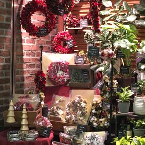 🎄🎅 YEGクリスマス装飾 🎁✨ ② エントランスの近くが華やかになっていました。 大きなリースとハボタンやシクラメンの入ったハンギング🌼 横浜イングリッシュガーデンにて。