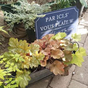 去年買ったヒューケラ、やっと寄せ植え認定されました🌿 後ろのくるくるのリーフも、2年くらい前に、寄せ植えを解体した時のもの。 テキトーにビニールポットに入れてその辺に置いておいたら、根っこが張って巨大化。掘り起こして再利用🌿 テキトーな寄せ植えの完成です(-ω☆)キラリ