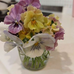 ビオラを3株買ってみました🌼 季節が少し早いので、思い切ってカット✄ お花は小さな花瓶に入れて、茎は初めて挿し芽に挑戦! 根付くといいなぁ〜🌼🌼