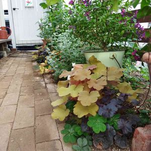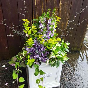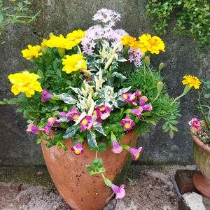 寄植え教室で作成しました。 売り場には、色とりどりのお花がたくさん揃っていて、膨大なお花の中から花材を選ぶのが至難の業! そして、組み合わせのバランスを見ながらで植え込むのが、パズルみたいで、頭がこんがらがります🌼🌿