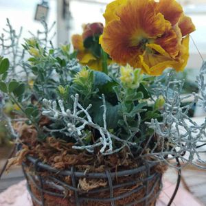 キリリとした、寒さが増した朝です(-ω☆)キラリ 小さなワイヤーバスケットに寄植えしてみました✾ ❁八重咲パンジーラブリーシュシュ ❁ロータスブリムストーン ❁プラチーナ