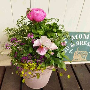 ピンクのブリキ鉢に植えてみたかったので、作ってみました。 今まで、植木鉢がこんなに大切なポイントだとは知らず、テキトーな事ばかりしてました! 植木鉢、好きな植木鉢に好きな花を植えるって、とっても幸福感がありますね~🌼 ✾ラナンキュラス ✾パンジー ももこ ✾スィートアリッサム ✾ハゴロモジャスミンミルキーウェイ ✾ワイヤープランツ ゴールデンガール
