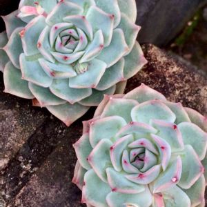 自宅デッキのハウス 最上段で管理している 手前「桃太郎」奥「チワワルビーブラッシュ」 朝日を浴びて爪がとっても目立ってます(^ν^) 桃太郎は多肉にハマったキッカケの子♡ もう三年目立派になりました(笑) でも根腐れさせたり…… 近くでバーベキューしたせいで 油の水玉模様になったり……思い出深い子です(笑)