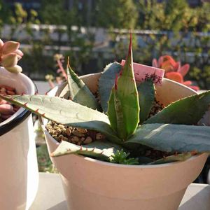 アガベ・吉祥天✨✨ 小さいため冬越し対策で 地植えから鉢上げしようと抜こうとしたら しっかり根付いてる〜😁 なので苗帽子と不織布で冬越しすることに☝🏻 大丈夫かなぁ〜🤔 同じ大きさのもう一株の吉祥天は 防寒対策した外の多肉棚にいます 育ちの違いを検証してみます😉👍🏻✨✨ 因みにこの子の方がウォーターマーク はっきり出てます( ̄▼ ̄*)ニヤッ