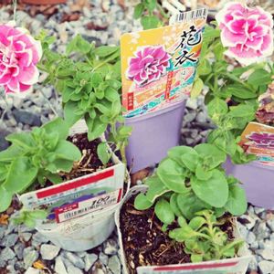 HCの『さらにお安くなりました』コーナーの中からお迎えしました‼️😄 半額ー‼️ 花があるのもないのもいろいろ welcome❗️ ペチュニア系なのでこれから長く楽しめそう😆🍀 花がなくてももう少し待てば咲くよね‼️🤔 楽しみ~~😆💕✨