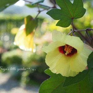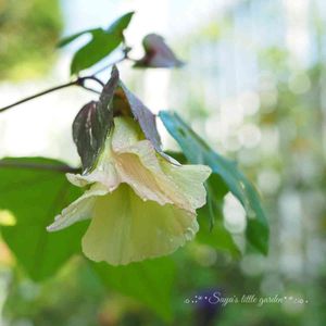 オクラに似たお花🌺種まきっ子🌱のコットン☁ 夕方に撮影したのでしっとりうつむき加減 ワタができたら収穫してリースに🌼 毎年のお楽しみです🎶