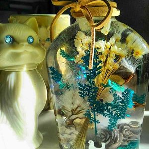 冬をテーマにしたハーバリウム作りました これで春夏秋冬のハーバリウムが揃った! 綿毛は多肉植物のドルフィンネックレスの種です トコちゃんにちょい似の猫は 香水瓶です