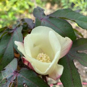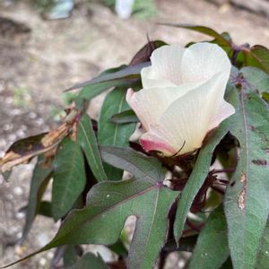 やっと咲いた❣️コットンの花 透き通るような淡い白 今年も会えた😉 摘芯した方の株はお花がついてくれません。どうしてかな?🙄