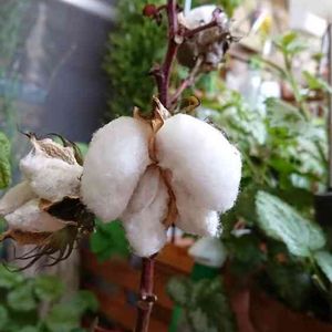 おはようございます🎵 コットンボールが弾けてます🎉 右上のpicから成長の様子です🌱 お花も可愛いく、出来上がったコットンもモフモフで可愛い💗😆💗 ワクワク楽しい栽培でした❣️
