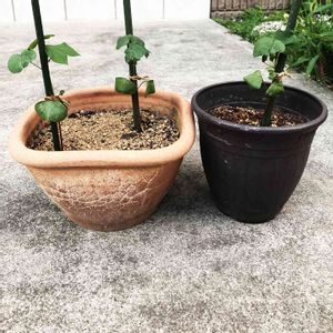 コットン 鉢の大きさに比例して苗が育っています🌱🌱🌱 全部で3鉢、それぞれ本葉が数枚。 触ってみると裏に少し毛の生えたようなザラザラとした触感です😱 早く大きな鉢を用意して植え替えないと🌱🌱
