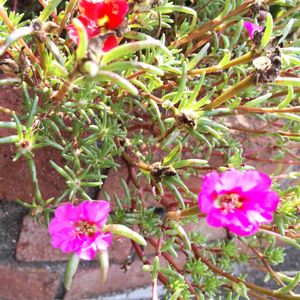 花壇で咲くマツバボタンです。 今年は早くも終盤に入った感じがします。 花の数が少なくなって、小さくなってきています。 あちこち花が咲いていた部分に種ができています。 この種がばら蒔かれて、来年また発芽する筈です。