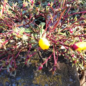 11月も後半になってかなり冷え込んできました。 そんな中でマツバボタンは、依然として頑張っています。 いくつかの黄色い蕾が咲こうとしているのですが、午後になっても開きません。 相当寒さが堪えているようです。 よく見ると、マツバボタンをかき分けてタピアンが伸びてきています。