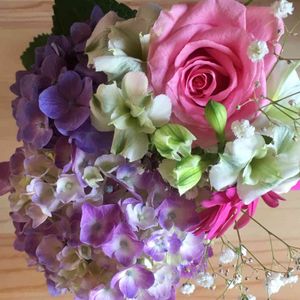 アジサイアレンジ💕 特に好きなガーベラ バラ アジサイで 丸くは難しい😅