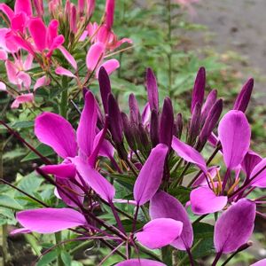 クレオメ✨ 素敵な色合い 花壇で咲きました 中々いい感じの 雰囲気が出てますね ほんのり香りと トゲトゲ 葉と花の間に種のさや? 面白いお花ですね