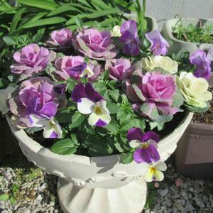葉牡丹とよく咲くスミレのシンプル寄せ💜 今日は強風のため、スミレがヒラヒラなびいてますが💦 葉牡丹はスプレータイプ。 よく咲くスミレは3種類入れてあるけど、12月になってから植えたのでまだ咲いていない苗も💦 一応、お正月に玄関に置くつもりで😊