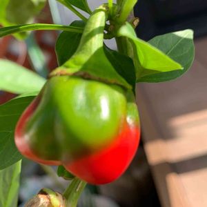 おはようございます。㊗️カラーピーマンを収穫しました。1個だけ赤くなりました。👀良く見たら🐛虫喰いがありました。💦 まあ、良いか😍🥰😻😊