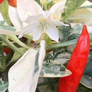 観賞用 トウガラシ💕✨ (斑入り) 茎の上部の葉の付け根から ちっちゃなお花で目立たない❀.*・゚ 白い花は5〜6枚の花弁が星形で 可愛い〜のでアップでパシャリ✨ やっぱり…真っ赤なトウガラシ🌶と 斑入り葉っぱ🌿が目立ちますね😊💓