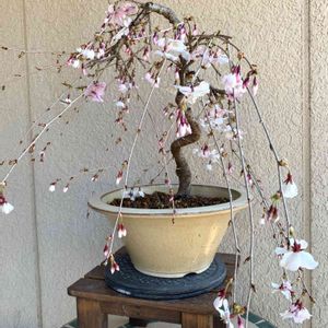 今朝の庭 玄関前にしだれ桜飾ってみた。 今週には、満開になりそう🌸
