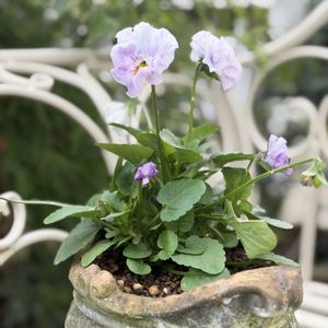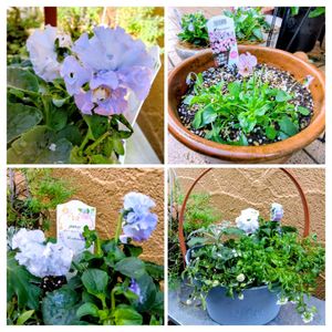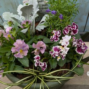 フリル咲きパンジー シエルブリエ 薄い水色の花だったりピンクがかった花だったり。 ひとつの苗から違う色みの花が楽しめて見惚れてしまう♡ ディコンドラシルバーフォールと見えてないけどシルバーレースの寄せ植えにしました。
